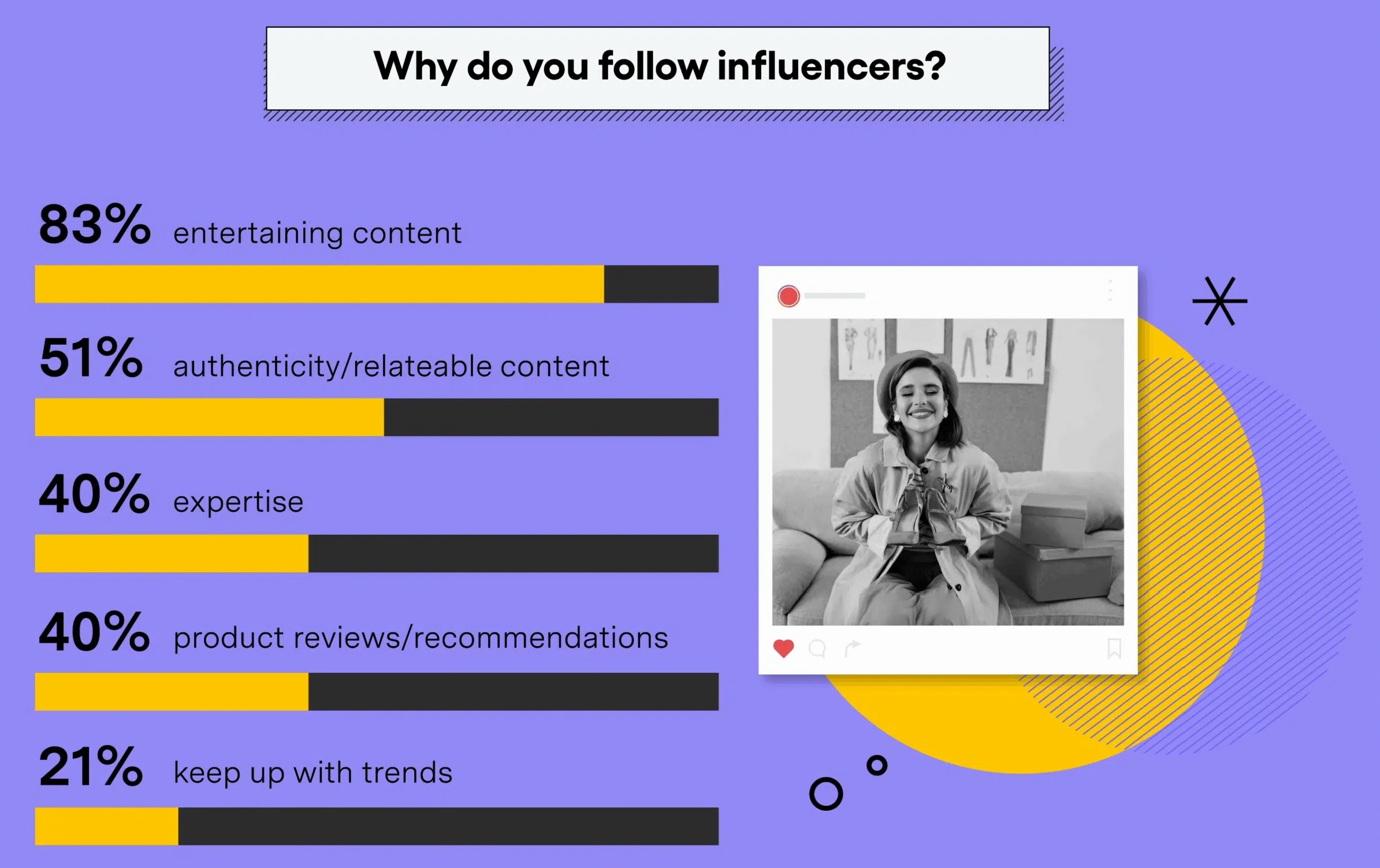 For 83%, following these online personalities is all about entertainment. Over half (51%) appreciate the authenticity or relatability of influencer content, while 40% value expertise and or product reviews. Finally, just over 1 in 5 follow influencers to keep up with trends.